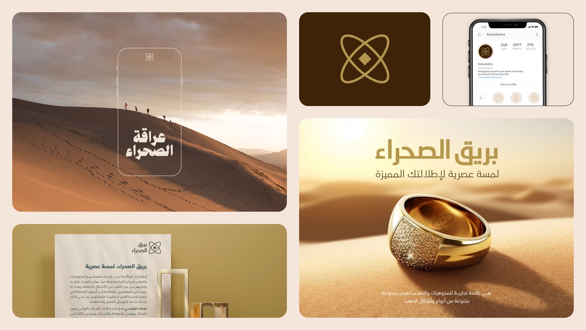 - العميل: بريق الصحراء - الخدمة: تصميم هوية بصرية كاملة لمتجر مجوهرات - التصنيف: مجوهرات وصياغة - المكان: السعودية/الدمام - المدة: 25 يوماً - السنة: 2023 م - 1444 هـ
