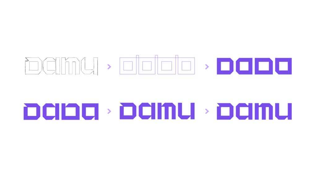 بدأت بعدها بتخطيط الشعار بعد أن وضحت لي الفكرة بشكل كبير فنبدأ أولا بأربعة مربعات وإنشاء الحروف كلها من هذه المربعات فخرجت لدي أربع شعارات أساسية كنت محتارا بينها فلا أعلم ما هو الخيار المناسب فقمت أيضا بأخذ الحرف الأول منها فقط لأرى ما هو المميز والذي يعبر عن المواصفات التي وضعتها حتى لو كان حرفا واحدا فقط